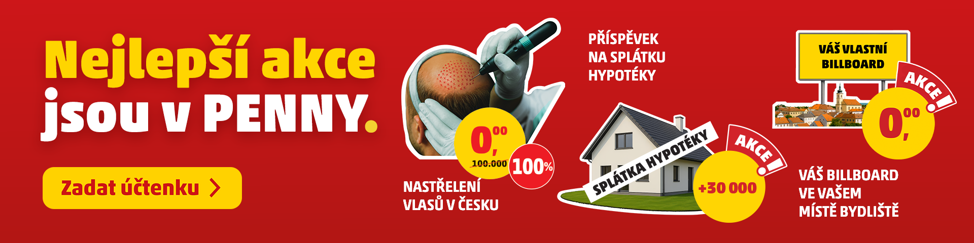 V PENNY máme, jak už jste zvyklí, nabídku, co vám vezme dech! Přispějeme vám na splátku hypotéky – 30 000 Kč vám rozhodně ulehčí start do nového roku! Dokonce se postaráme o vaši transplantaci vlasů v hodnotě 100 000 Kč na renomované klinice v ČR – ať už jde o nové vlasy nebo nové sebevědomí, my vás podpoříme! 😎