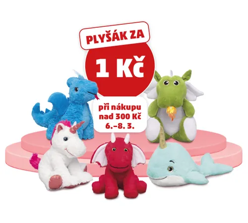 V termínu 6.–8. 3. 2026 můžete při nákupu nad 300 Kč zakoupit plyšovou hračku za 1 Kč. Plyšovou hračku najdete před pokladnami. V případě nákupu v hodnotě nižší než 300 Kč je cena plyšové hračky 99,90 Kč. Do nákupu se nezapočítávají vratné obaly. Fotografie je pouze ilustrativní. Akce platí do vydání zásob. Pravidla akce naleznete v tomto dokumentu.