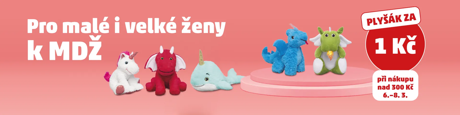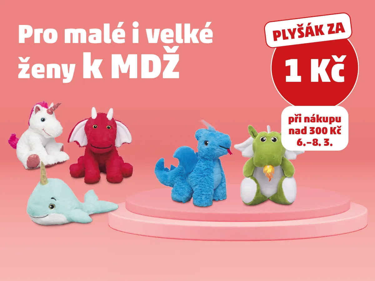 Mezinárodní den žen není o velkých slovech, je o malých pozornostech, které vykouzlí úsměv. Od 6. do 8. 3. tak můžete při nákupu nad 300 Kč přihodit do košíku roztomilého plyšáka jen za 1 Kč. Jednorožec, dráček nebo třeba velryba? Stačí si vybrat toho pravého. A jestli máte doma malou princeznu, velkou hrdinku, nebo jste tou hrdinkou vy sama, důvod k radosti se vždycky najde.