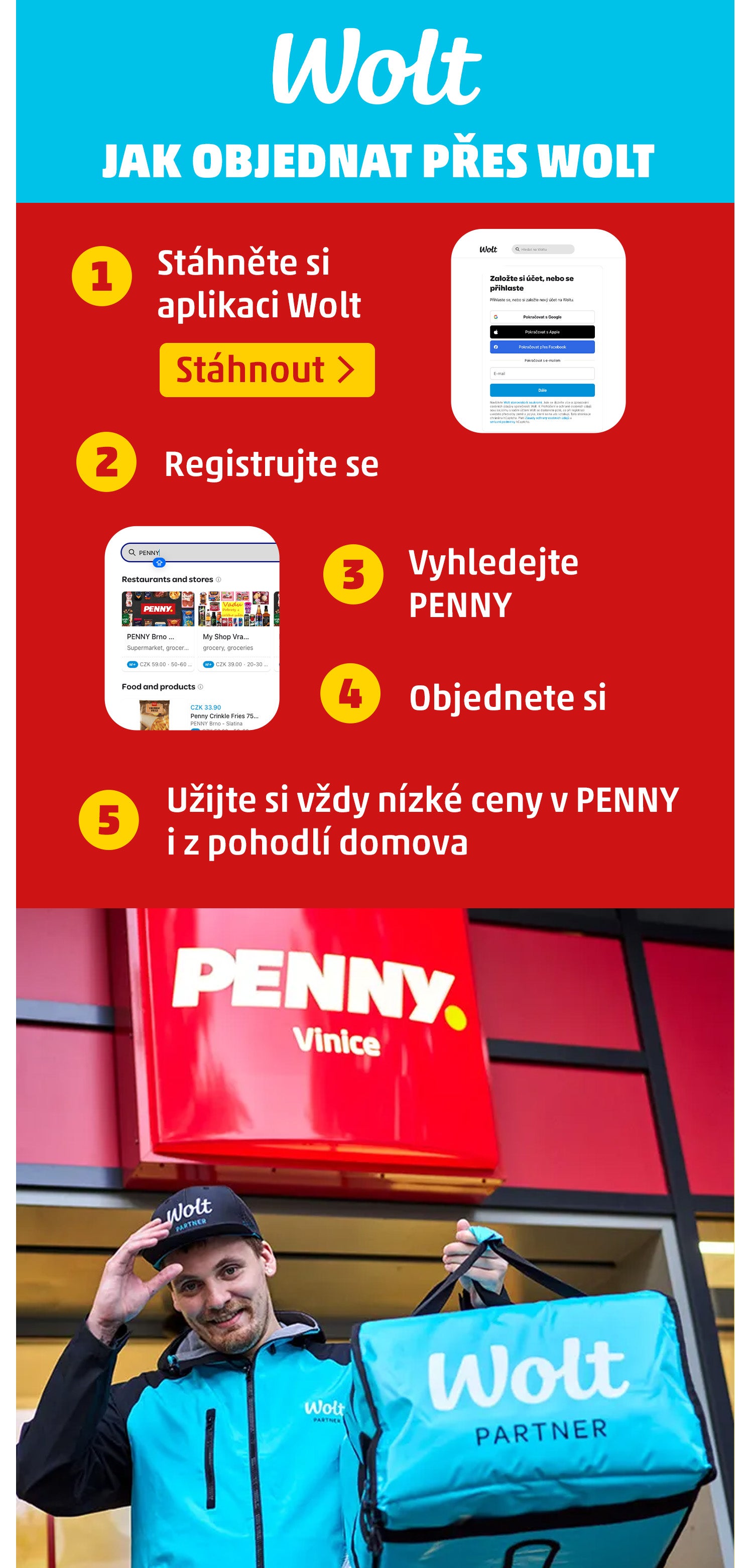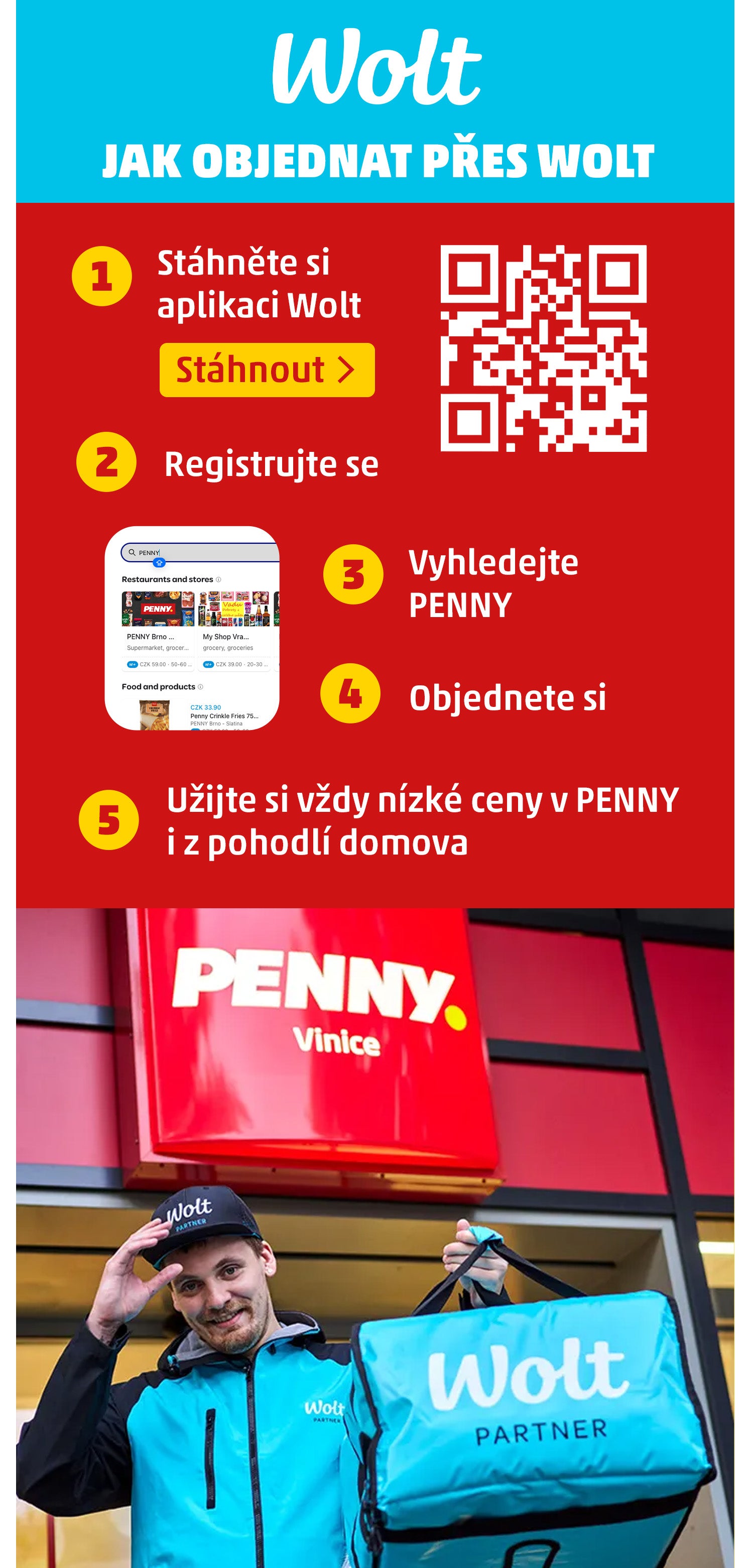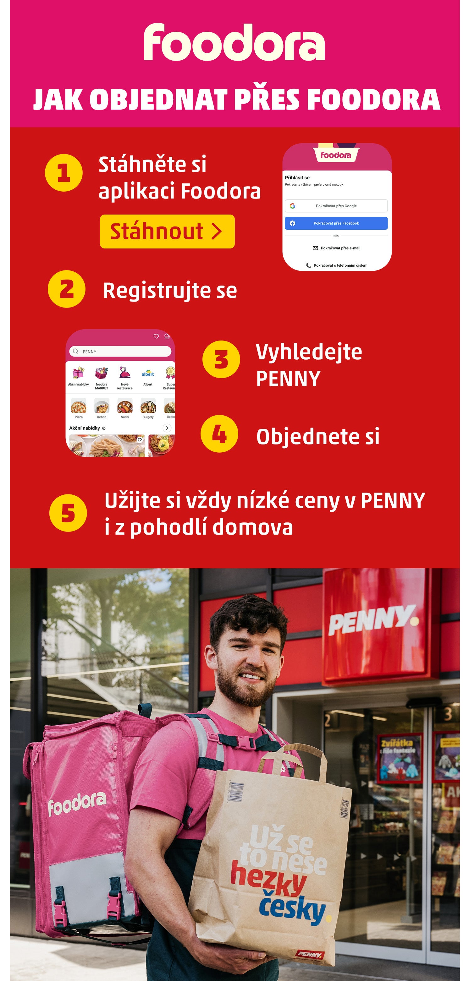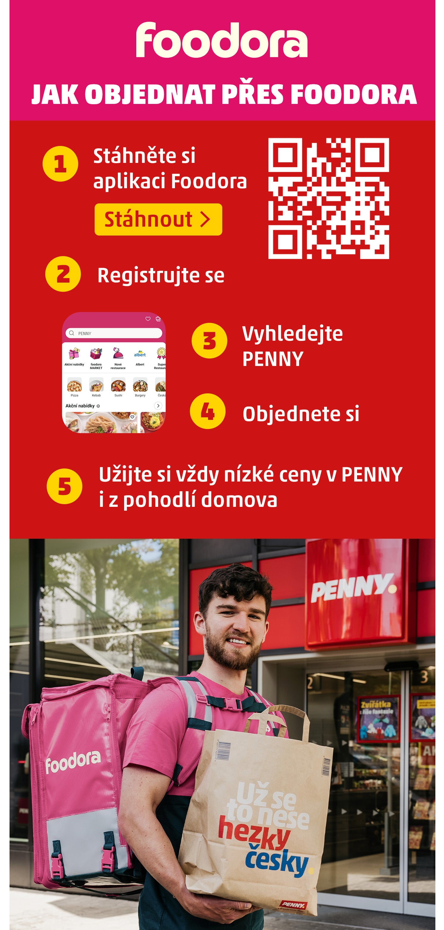 Nemáte čas běžet do obchodu, venku prší nebo se prostě necítíte na to vyrazit mezi regály? PENNY přijede za vámi. Díky spolupráci s rozvážkovými službami Wolt a Foodora si můžete objednat potraviny přímo z vybraných PENNY prodejen. Stačí pár kliknutí v aplikaci, vybrat oblíbené produkty a kurýr vám je přiveze až ke dveřím. Snadno, rychle a přesně tehdy, když to potřebujete.