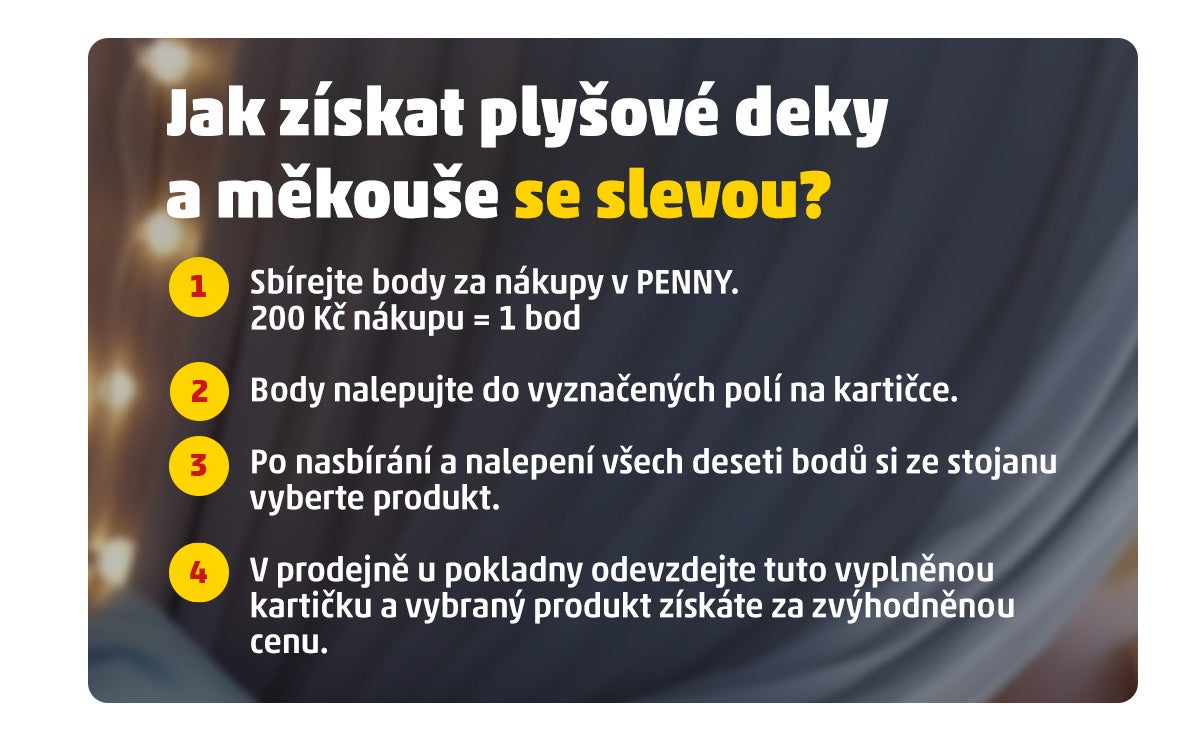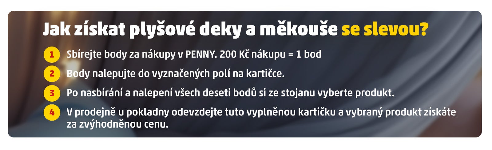 Nakupujte v PENNY, sbírejte body a vyměňte je za plyšáky, které vám poskytnou nejen pohodlí, ale i úsměv na tváři, nebo za deky, které vám budou dělat společnost během každého chladného dne. Ať už si vyberete cokoliv, věříme, že vaše odměna se stane vaším ideálním společníkem pro podzimní a zimní pohodu.