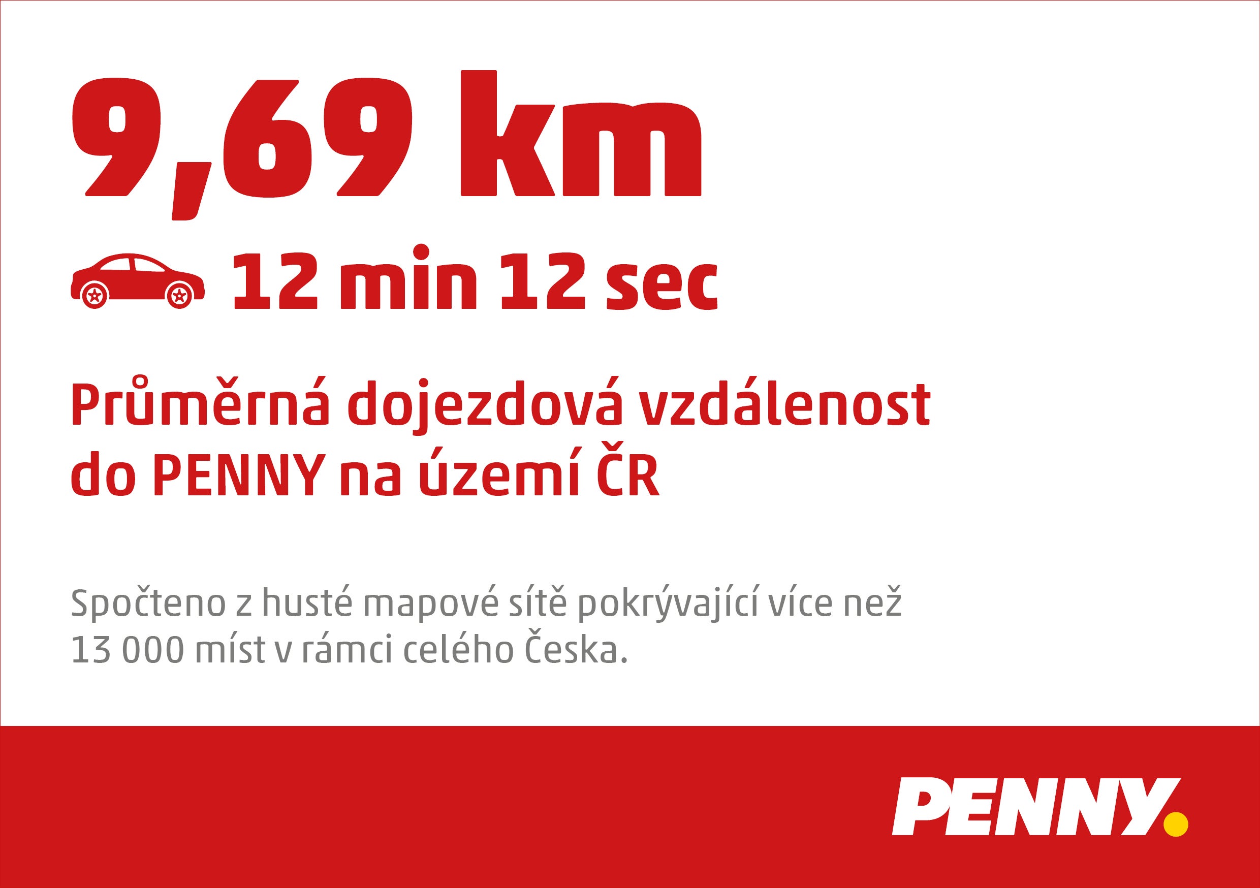 9,69 kilometru, taková je přesná průměrná vzdálenost k nejbližšímu PENNY, počítaná z husté mapy cca 13 tisíc míst v celé ČR, v níž jsou zahrnuty i ty nejodlehlejší lokality v Česku. Průměrná doba dojezdu autem čítá 12 minut a 12 vteřin. Pro srovnání – druhá největší síť v Česku má podle této metodiky průměrnou vzdálenost 12,4 kilometru a dojezd rovných 15 minut, třetí pak 16,41 kilometru a 18 minut 54 vteřin. „Při letním cestování po Česku tak příliš nezáleží na tom, zda lidé tráví volno v hotelu ve městě, v kempu nebo pod stanem uprostřed přírody, do našich obchodů to mají vždy blízko. V PENNY najdou vše na dovolenou, víkend na chalupě, nebo cestu na kole, od čerstvé zeleniny, přes špekáčky, pivo a limonády až po zmrzlinu a celou řadu českých produktů,“ říká Draško Lazović, jednatel PENNY pro prodej, výstavbu, expanzi a supply chain.
