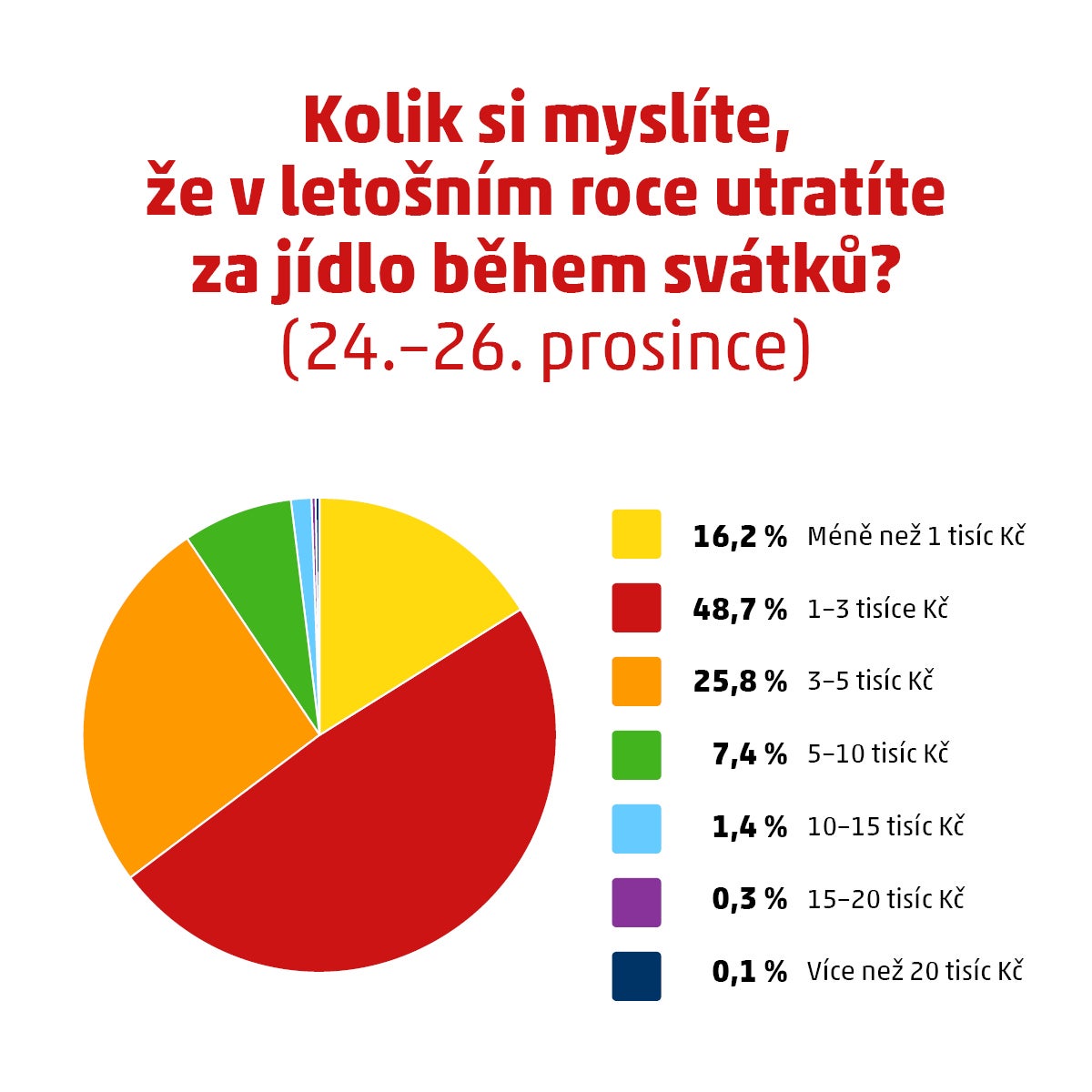 Co se týče konkrétních částek, drtivá většina Čechů (91 %) utratí za jídlo na svátky do 5 000 Kč, nejčastěji něco mezi 1 000 Kč a 3 000 Kč (49 %), potažmo 3 000 Kč a 5 000 Kč (26 %). Více než 10 000 Kč pak za potraviny vydá každý padesátý Čech.