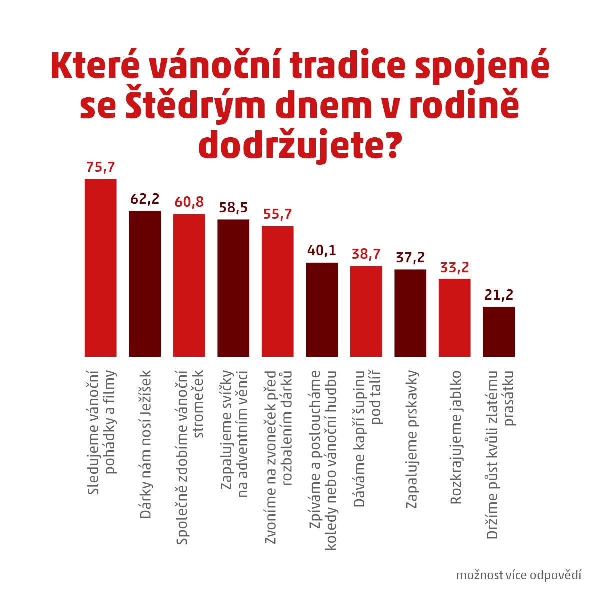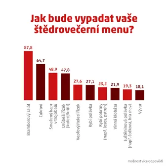 Do smažení řízku se na Štědrý den vrhnou skoro tři čtvrtiny z nás. Prim budou hrát ty kuřecí a krůtí, 28 % respondentů však dá šanci řízku vepřovému či telecímu. Populárního kapra v trojobalu si osmaží 49 % Čechů, v tradičních úpravách na modro nebo na černo si ho pak vychutná pouhých 7 % dotázaných. Neznamená to však, že by Češi zcela zanevřeli na rybí pokrmy. Lososa, pstruha nebo dalšího zástupce rybí říše si dopřeje 23 % lidí, stejný podíl zase štědrovečerní menu odstartuje rybí polévkou. Vinná klobása pak ozdobí každý pátý slavnostní stůl.
