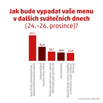 Najdou se i tací, kterým se lety osvědčené recepty omrzely. 13 % Čechů proto vymění majonézu za jogurt a zkusí menu připravit ve zdravější verzi. Netradiční jídla vyzkouší 6 % respondentů, zhruba poloviční počet se inspiruje ve vánočních receptech ze zahraničí.