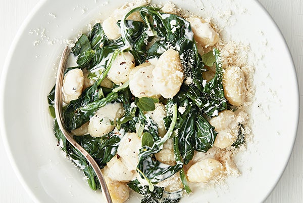 Počet porcí remove add .1 balenígnocchů sůl3 lžícemásla4 stroužků česneku, nakrájených na plátky300 gčerstvého listového špenátu150 mlsmetany na vaření2 lžícenastrouhaného sýra čerstvé oregano na ozdobuPřipravte si