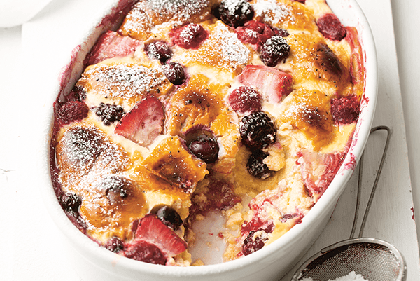 Namažte pečivo z obou stran tenkou vrstvou másla. Máslem vymažte i zapékací nádobu o objemu 1,5 litru. Rozložte do ní pečivo a posypte lesním ovocem.