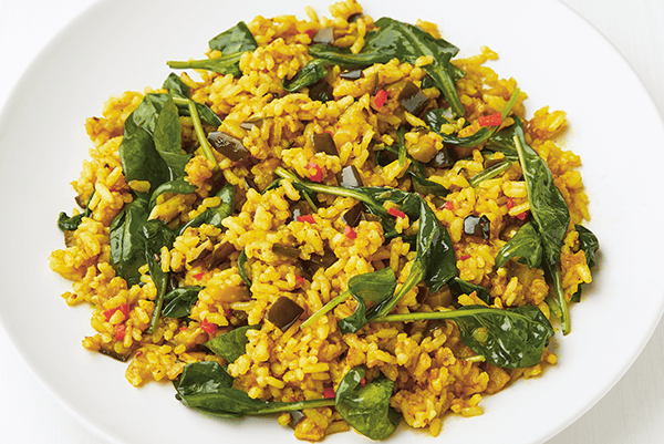 Do pánve přidejte rýži a špenát a nechte prohřát. Vmíchejte petrželku a podávejte s česnekovým jogurtem.