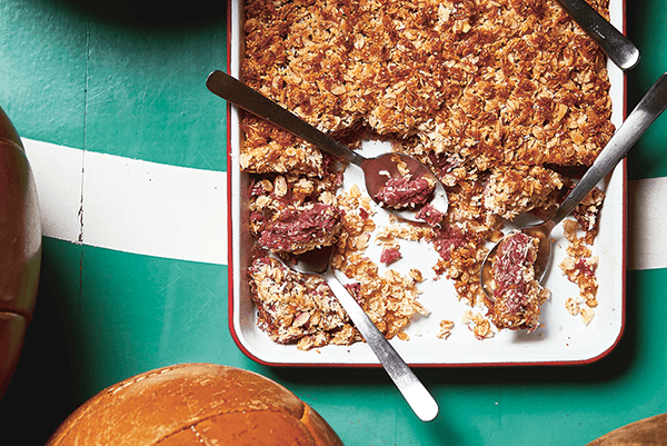 Malinovou náplň rozetřete na korpus ve formě a navrch rozdělte zbytek vločkové směsi. Pečte 15–20 minut dozlatova.