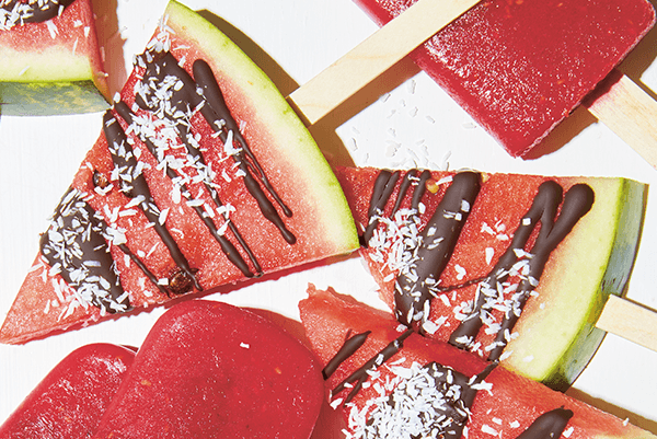 Z melounu ukrojte plátek a rozkrájejte na trojúhelníky. Do kůry u každého udělejte ostrým nožem zářez a zasuňte do něj dřívko. Trojúhelníky melounu osušte papírovou utěrkou a položte je na tác vyložený pečicím papírem.