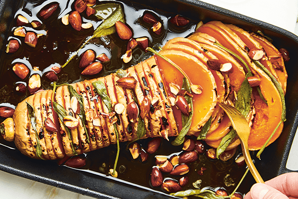 Smíchejte v rendlíku med, ocet a šalvějové listy. Přiveďte k mírnému varu a nechte 4–5 minut redukovat. Polovinou zálivky pokapejte dýni, šalvějové listy zastrkejte do zářezů a pečte ještě 5–10 minut.