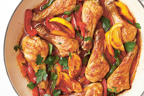 1Krok 1Troubu předehřejte na 200 °C.2Krok 2Rozpalte v pánvi vhodné do trouby trochu olivového oleje a opečte na něm zlehka ze všech stran kuřecí paličky.3Krok 3Přidejte papriky, citron a bobkový list. Vlijte bujon, osolte a opepřete. 4Krok 4Pečte 30–35 minut, omáčka by měla zhoustnout.5Krok 5Před podáváním odstraňte citron a bobkový list a posypte petrželkou.
