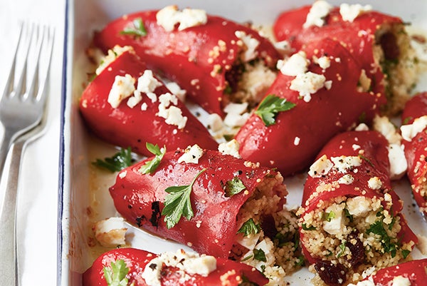 Promíchejte a dochuťte solí a pepřem. Kuskusem naplňte papriky, dejte je do pekáčku, posypte je zbylým sýrem a zakápněte olejem.