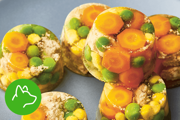 Maso natrhejte na malé kousky. Rozdělte maso a zeleninu do formiček velkých, jako je obvyklá porce vašeho pejska. Široko jich má 10. Zalijte želatinou a nechte v lednici ztuhnout.
