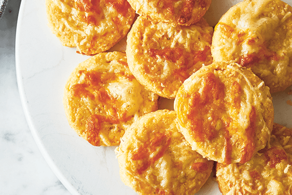 Do receptu na základní sušenky se sýrem Grana Padano přidejte čedar, ementál, sýr Grana Padano, ledovou vodu a zpracujte podle instrukcí ze základního receptu.