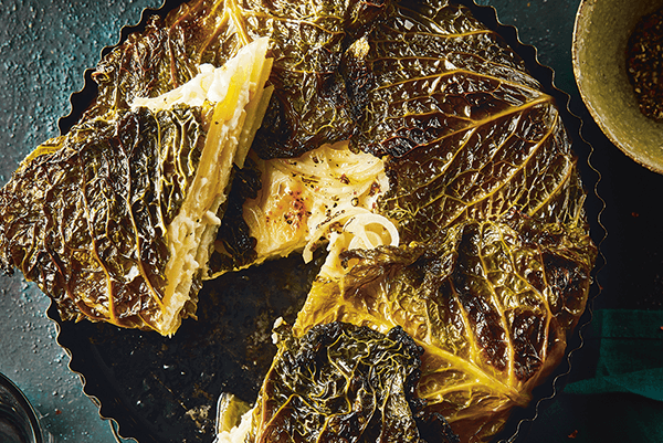 Šest největších zelných listů použijte na vyložení dna a stran vymazané formy o průměru 22 centimetrů. Listy by měly nahoře zhruba o 8 centimetrů přesahovat okraj formy, aby pak uzavřely koláč. Na zelí rozložte vrstvu brambor tak, aby se plátky částečně překrývaly. Další vrstva je z cibule, pak z mozzarelly. Tyto vrstvy opakujte ještě dvakrát.
