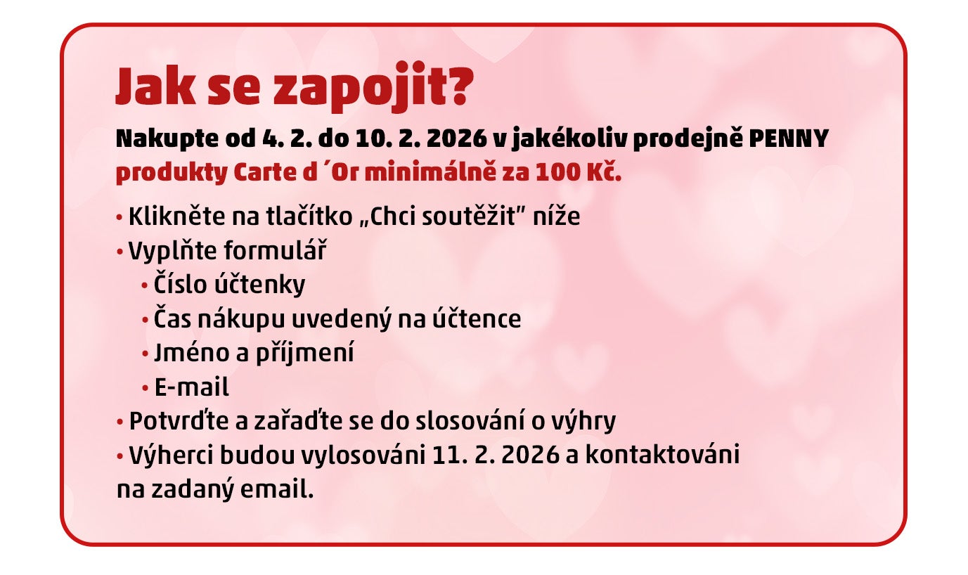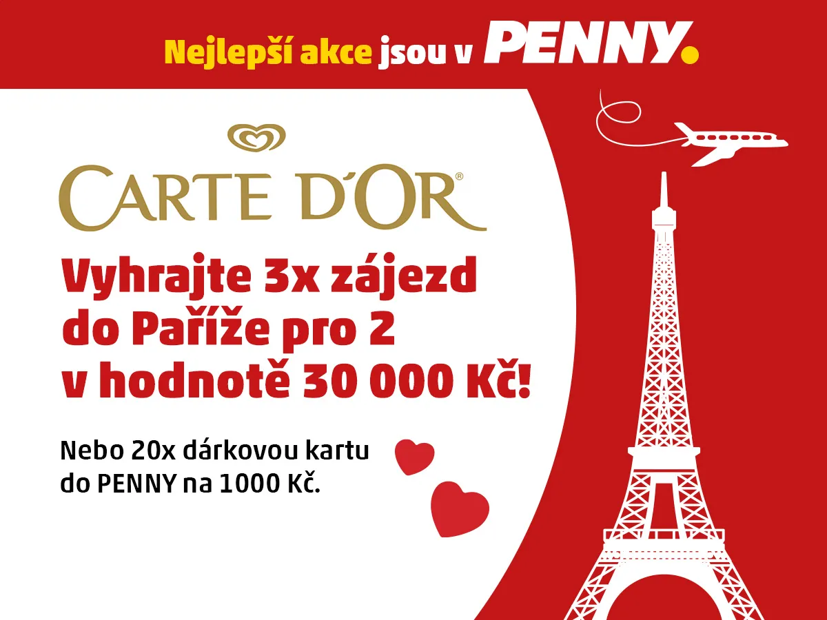 Valentýnský čas plný lásky a skvělých akcí je tady! 💖 Stačí v PENNY od 4. do 10. února 2026 zakoupit zmrzlinu Carte d'Or v hodnotě minimálně 100 Kč a můžete od Carte d'Or získat zájezd do Paříže v hodnotě 30 000 Kč! ✈️💕 Anebo jednu z 20x dárkových karet na 1000 Kč do PENNY! 💸