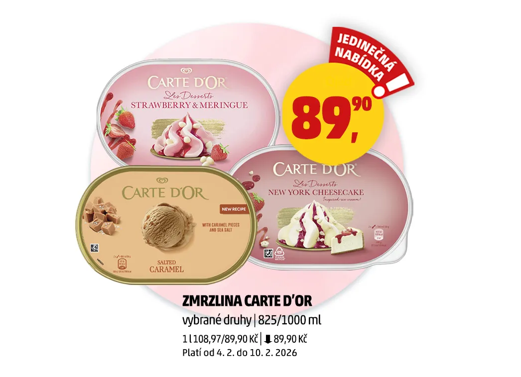 V prodejnách PENNY najdete zmrzliny Carte d'Or v několika lahodných příchutích, které vás zaručeně potěší – od slaného karamelu přes osvěžující jahodovou kombinaci s pusinkami až po krémový New York Cheesecake. Stačí si vybrat tu pravou pro vás a zapojit se do naší akce!