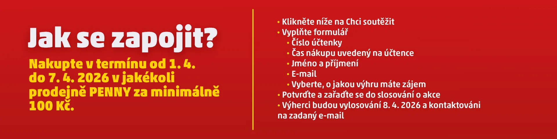 V PENNY máme, jak už jste zvyklí, nabídku, co vám vezme dech! Stačí kliknout na "Chci soutěžit", zaregistrovat svou účtenku a vybrat výhru, o kterou byste měli zájem. Vybírat můžete z těchto skvělých nabídek: